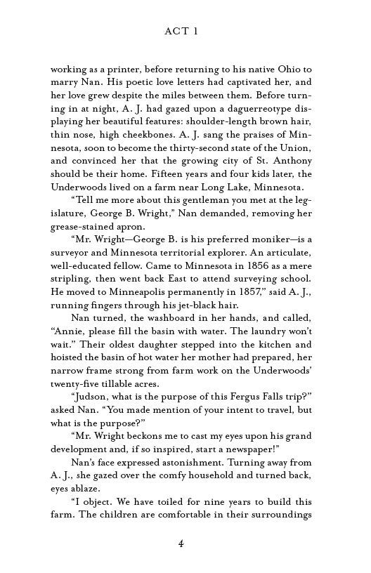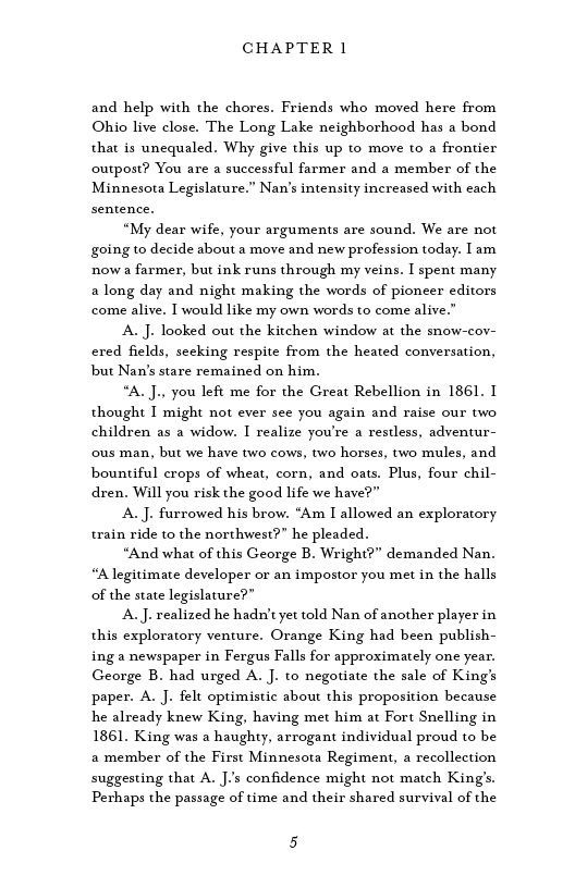 Tired from another fall corn harvest, 40-year old A.J. Underwood wonders if there’s an easier life? A.J. revels in the challenges of farm work, but his bleeding hands from corn shucking trigger doubts about his chosen profession. The part-time Minnesota legislator has recently met George B. Wright in the halls of the state capitol. Wright, a surveyor and land developer, has a civic mission – convince A.J. to start a newspaper in Wright’s new development, Fergus Falls, a fledgling frontier town in west-central Minnesota.